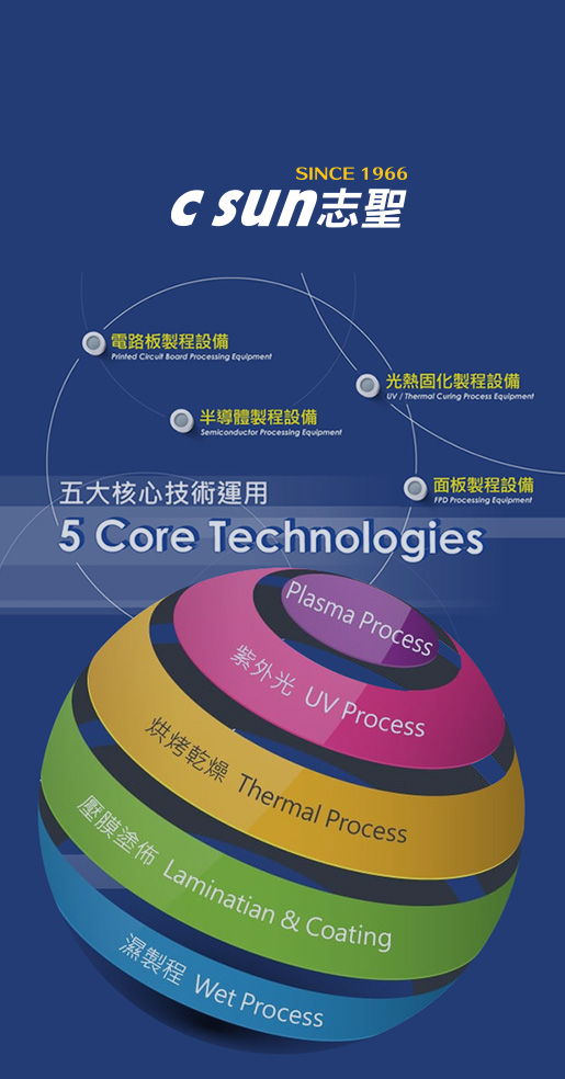 • 志圣科技以光与热为核心,专注整合研究紫外光制程、烘烤制程、压膜涂布、湿制程及电浆制程五大核心技术。